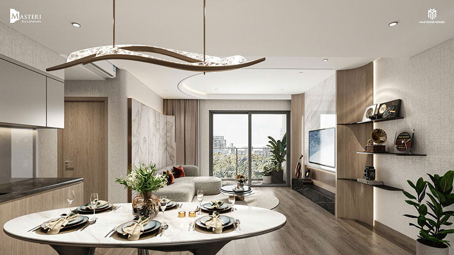 Tại các căn hộ Masteri Era Landmark, khu vực phòng khách và phòng bếp có thể nói là “trái tim” quan trọng bậc nhất, nơi các thành viên trong gia định dành thời gian sinh hoạt chung và tương tác với nhau nhiều nhất trong ngày, được thiết kế liên thông tạo sự liền mạch và mở rộng không gian sử dụng.