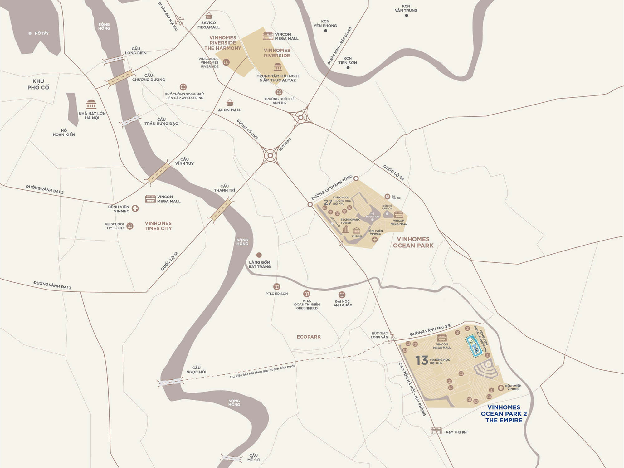 Cùng với đó là hàng loạt các dự án giao thông điểm như Vành Đai 4, hoàn thiện Vành đai 3.5 hay các cây cầu mới bắc qua Sông Hồng như cầu Trần Hưng Đạo, cầu Ngọc Hồi hay cầu Mễ Sở, Vinhomes Ocean Park 2 sẽ nằm trong khu vực trung tâm phát triển mới phía Đông thủ đô.